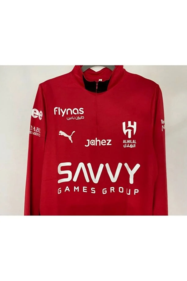 هذا قميص تدريب أحمر زاهٍ بسحاب ربعي، خاص بنادي الهلال السعودي لكرة القدم، من إنتاج شركة بوما . يتميز القميص بياقة عالية وبطانة داخلية سوداء وسحاب نصفي.