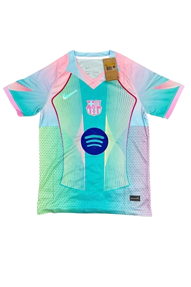 هذا قميص تدريبي/مباريات خاص نابض بالحياة من نايكي، مخصص لنادي برشلونة . يتميز بتصميم فريد متعدد الألوان بتدرجات الباستيل، يجمع بين درجات الأزرق المخضر، والأخضر النعناعي، والوردي الفاتح، واللافندر .