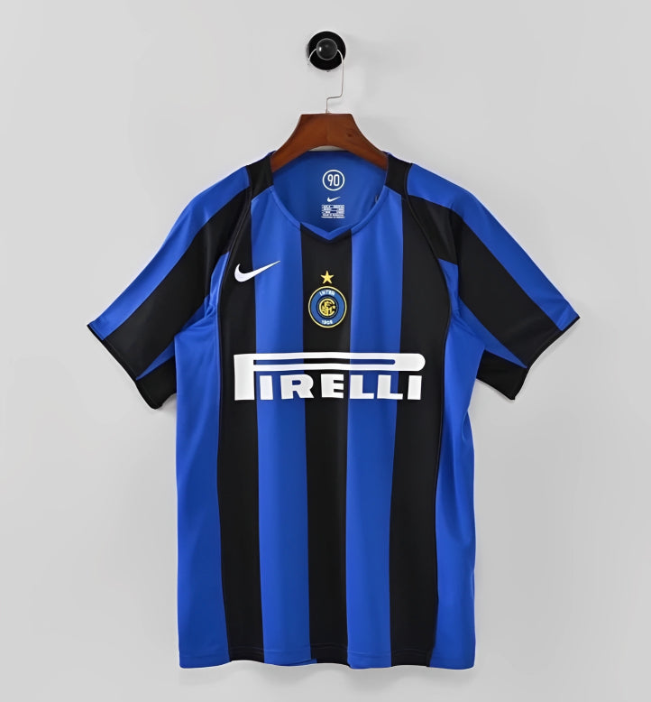 تُظهر هذه الصورة قميص إنتر ميلان الكلاسيكي، الذي يُعيد إلى الأذهان حقبة "توتال 90" الشهيرة من نايكي في منتصف العقد الأول من الألفية الثانية. يتميز القميص بخطوط النيراتزوري التقليدية العمودية باللونين الأزرق والأسود، مع شعار بيريللي الأسطوري في المنتصف. كما يتضمن شعار نايكي على الجانب الأيمن من الصدر، وشعار نادي إنتر ميلان أسفل الياقة، يعلوه نجمة ذهبية تُمثل ألقاب الدوري. يُعرض القميص على علاقة خشبية أمام خلفية محايدة، مما يُبرز تصميمه الخالد وأهميته التاريخية في كرة القدم الإيطالية.