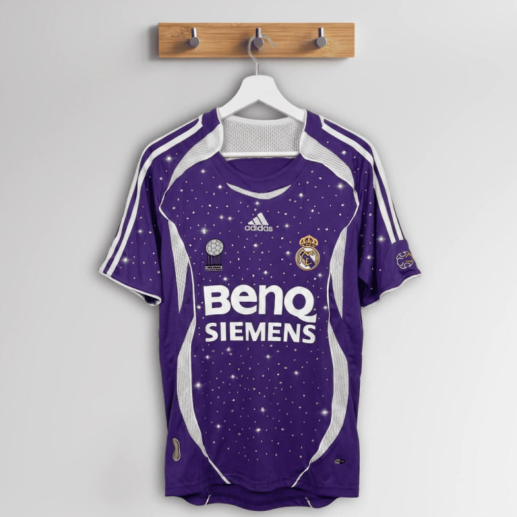 استرجع حقبة "غالاكتيكو" مع هذا التصميم المذهل لقميص ريال مدريد الاحتياطي لموسم 2006-2007 . يُضفي هذا القميص المبتكر لمسةً عصريةً على الطقم الأرجواني الداكن الشهير الذي ارتداه أساطير مثل راؤول وبيكهام وكانافارو، مع لمسةٍ براقةٍ تُحاكي النجوم. يتميز القميص بشعار الراعي الكلاسيكي BenQ Siemens وألواح Adidas Teamgeist المنحنية المميزة، ليُشكّل مزيجًا مثاليًا بين تاريخ كرة القدم وأزياء الشارع العصرية.